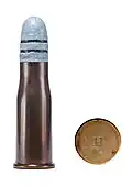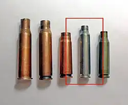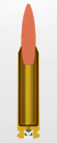 ![]() 5.56×45mm NATO with measurement, left to right: Bullet, case, and complete cartridge | ||||||||||||||||||||||||