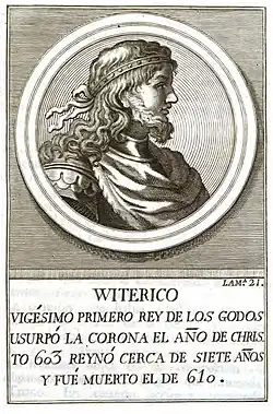 - Spring – Witteric, counting on the support of the nobles, attacks the royal palace in Toledo, and overthrows King Liuva II. He cuts off his right hand, and has him executed. Witteric becomes the new king of the Visigoths.[1]