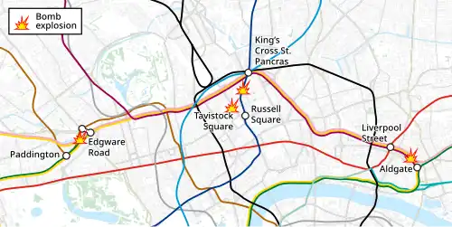 Three terrorists separately detonated three homemade bombs in quick succession aboard London Underground trains in Inner London. Later, a fourth terrorist detonated another bomb on a double-decker bus in Tavistock Square. The train bombings occurred on the Circle Line near Aldgate and at Edgware Road and on the Piccadilly Line near Russell Square. All four explosions were caused by improvised explosive devices made from concentrated hydrogen peroxide and pepper, packed into backpacks.