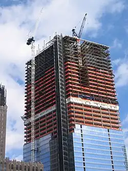 Work next proceeded on the office tower itself. An unusual approach was used in constructing the building; erecting the steel frame before adding the concrete core. This approach allowed the construction schedule to be shortened by a few months.[12] By July 2005, American Express Financial Advisors was planning to lease 20,000 square feet (1,900 m2) of space, making it the building's first tenant.[14][15] Although Silverstein intended for the building's design to attract tenants, he wanted occupants to pay $50/ft2 ($540/m2) to lease space by 2005, which New York magazine called "easily the highest price in lower Manhattan".[16]