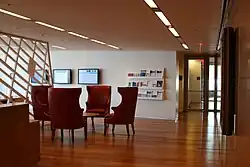Inside the main lobby, artist Jenny Holzer created an LED installation[16][64][68] with glowing text moving across wide plastic panels.[17] The wall measures 65 ft (20 m) wide and 14 ft (4.3 m) tall. Holzer worked with Klara Silverstein, the wife of Larry Silverstein, to select poetry for the art installation.[68] The wall of the lobby is structurally fortified as a security measure.[68] On the upper stories, some tenants customized the design of their spaces. The space occupied by Mansueto Ventures was designed to maximize natural light exposure and has an open floor plan.[69] The 40th-floor space used by the New York Academy of Sciences was designed by H3 Hardy Collaboration Architecture and includes a reception lobby with an openwork screen; a 296-seat event room; and a horizontal 72-foot-long (22 m) mural.[37]