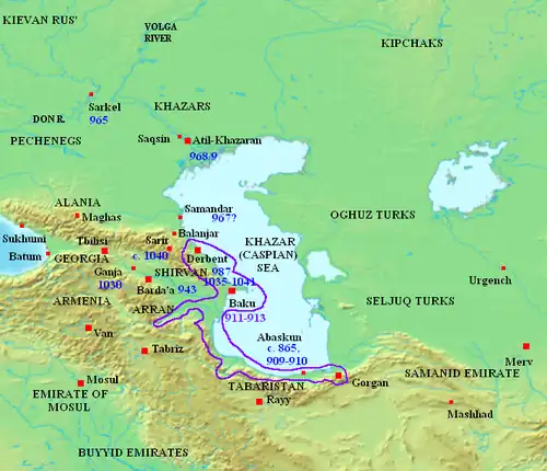 - Caspian expeditions of the Rus': The Rus' under the Varangian prince Igor I of Kiev sail up the Kura River, deep into the Caucasus, and defeat the forces of the Sallarid ruler Marzuban ibn Muhammad. They capture the fortress city of Barda (modern Azerbaijan).