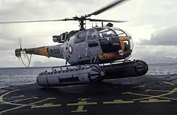 By 2017, the French Navy were still using the Alouette III in a reduced capacity, nonetheless being used to routinely conduct both Search and Rescue and logistics missions.[28] Since the 1970s, the type has gradually been supplanted by the larger Eurocopter AS365 Dauphin, and later on, by the specialised Eurocopter AS565 Panther as an anti-submarine warfare platform. The use of twin-engined rotorcraft in the maritime environment has become somewhat of an expected standard, one which the single-engined Alouette III cannot satisfy, putting the type at an obvious disadvantage.[1] During January 2018, it was announced that the French Navy would be replacing its remaining Alouette IIIs with rented Aérospatiale SA 330 Pumas as a stop-gap measure; this decision was reportedly taken due to its increasing unreliability, rapidly inflating operating costs, and the sheer age of the fleet.[1][29] However, as of 2021 the Alouette III was still reported to be in service.[30] The aircraft was finally withdrawn from French Navy service in June 2022.[31] It had been in service for 60 years and was in active use right to the end, with the last three ending their service at the end of December.[32] The aircraft was long known for ease of maintenance, which aided its use overseas, however and the end of its life it was requiring increasing maintenance hours and it was becoming hard to get spare parts which were no longer in production. The aircraft was still be used for training, interdiction missions, and shorter range mission.[32]