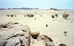 More than 430 vascular species have been recorded so far in the Aïr mountains.[10] The location of the Aïr as a southern extension of the Hoggar mountain range makes it a connection between the Saharan Flora and the Sahelian Flora.[11] However, the presence of mountains up to 2000 m a.s.l. generates locally favourable conditions for several species of the Sudanian zone and the Mediterranean zone.[12]