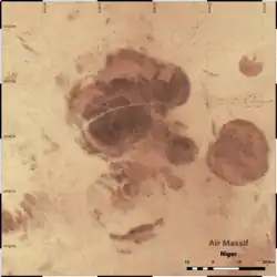 The massif contains volcanic features including the extinct caldera of Arakao, Cenozoic lava flows of hawaiite to trachyte composition, volcanic cones, tuff rings and one of the largest ring dike systems in the world.[8] At Izouzaoenehe, lie the marble Blue Mountains, and the lower Zagado valley is surrounded by white marble hills. Carboniferous sandstone and coal units in the Iullemmeden Basin just to the west of the massif contain uranium mineralisation sourced from the granites of the massif.[9]