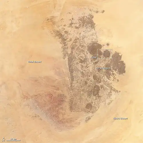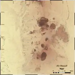 The Aïr Mountains or Aïr Massif[1] (Tamajăq: Ayǝr; Hausa: Eastern Azbin, Western Abzin) is a triangular massif, located in northern Niger, within the Sahara. Part of the West Saharan montane xeric woodlands ecoregion, they rise to more than 1,800 m (5,900 ft) and extend over 84,000 km2 (32,000 sq mi).[2] Lying in the midst of desert north of the 17th parallel, the Aïr plateau, with an average altitude between 500 and 900 m (1,600 and 3,000 ft), forms an island of Sahel climate which supports a wide variety of life, many pastoral and farming communities, and dramatic geological and archaeological sites. There are notable archaeological excavations in the region that illustrate the prehistoric past of this region.[3] The endangered African wild dog (Lycaon pictus) once existed in this region, but may now be extirpated due to human population pressures in this region.[4]