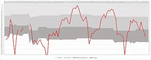 A.C. Perugia were founded on 9 June 1905, after the merger of U.S. Fortebraccio and Libertas.[6] During the early 1900s, the club primarily engaged in regional competitions.[7] Throughout the 1930s, Perugia experienced significant growth, culminating in its inaugural promotion to Serie B in 1933. Notably, in 1937, Perugia constructed its first official stadium, Santa Giuliana. After a second promotion to Serie B in the season 1945–46, Perugia spent almost all of the 1950s in the lower divisions.[7]