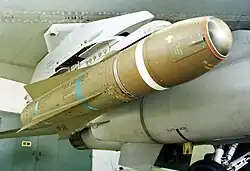 The most modern versions of the Maverick are the AGM-65H/K, which were in production as of 2007.[1] The AGM-65H was developed by coupling the AGM-65B with a charge-coupled device (CCD) seeker optimized for desert operations and which has three times the range of the original TV-sensor;[2][13] a parallel USN program aimed at rebuilding AGM-65Fs with newer CCD seekers resulted in the AGM-65J.[2] The AGM-65K, meanwhile, was developed by replacing the AGM-65G's IR guidance system with an electro-optical television guidance system.[1]