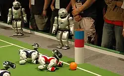 AIBO (Artificial Intelligence RoBOt, homonymous with aibō (相棒), "pal" or "partner" in Japanese) is a series of robotic dogs designed and manufactured by Sony. Sony announced a prototype Aibo in mid-1998,[1] and the first consumer model was introduced on 11 May 1999.[2] New models were released every year until 2006. Although most models were inspired by dogs, other inspirations included lion cubs and space explorers. Only the ERS-7, ERS-110/111 and ERS-1000 versions were explicitly a "robotic dog", but the 210 can also be considered a dog due to its Jack Russell Terrier appearance and face.[3] In 2006, AIBO was added into the Carnegie Mellon University Robot Hall of Fame.[4]