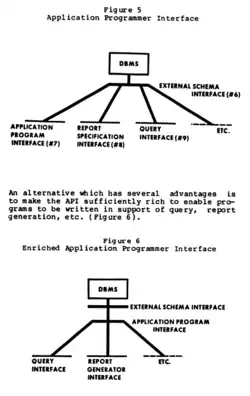 The term was introduced to the field of databases by C. J. Date[13] in a 1974 paper called The Relational and Network Approaches: Comparison of the Application Programming Interface.[14] An API became a part of the ANSI/SPARC framework for database management systems. This framework treated the application programming interface separately from other interfaces, such as the query interface. Database professionals in the 1970s observed these different interfaces could be combined; a sufficiently rich application interface could support the other interfaces as well.[9]