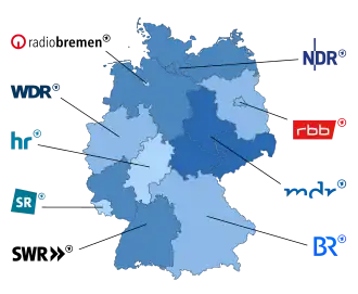 - ^ German pronunciation: [ˌaːʔɛʁˈdeː] ⓘ; full name: Arbeitsgemeinschaft der öffentlich-rechtlichen Rundfunkanstalten der Bundesrepublik Deutschland, pronounced [ˈaʁbaɪtsɡəˌmaɪnʃaft deːɐ̯ ˌʔœfn̩tlɪçˈʁɛçtlɪçn̩ ˈʁʊntfʊŋkˌʔanʃtaltn̩ deːɐ̯ ˈbʊndəsʁepuˌbliːk ˈdɔʏtʃlant] ⓘ – "Working group of public broadcasters of the Federal Republic of Germany"; see § Name