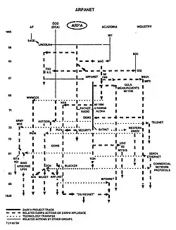 Bob Kahn moved to DARPA and, together with Vint Cerf at Stanford University, formulated the Transmission Control Program for internetworking.[14] As this work progressed, a protocol was developed by which multiple separate networks could be joined into a network of networks; this incorporated concepts pioneered in the French CYCLADES project directed by Louis Pouzin and the ideas of Bob Metcalfe at Xerox Parc. Version 4 of TCP/IP was installed in the ARPANET for production use on January 1, 1983, after the Department of Defense made it standard for all military computer networking.[15][16]