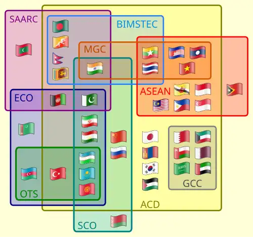 ASEAN engages with other international entities in the Asia-Pacific region and other parts of the world. It is a major partner of the EUTooltip European Union, UNTooltip United Nations, SCOTooltip Shanghai Cooperation Organisation, PATooltip Pacific Alliance, GCCTooltip Gulf Cooperation Council, Mercosur, CELACTooltip Community of Latin American and Caribbean States, and ECOTooltip Economic Cooperation Organization.[20] It also hosts diplomatic missions throughout the world, maintaining a global network of relationships that is widely regarded as the central forum for cooperation in the region.[21] Its success has become the driving force of some of the largest trade blocs in history, including APECTooltip Asia-Pacific Economic Cooperation and RCEPTooltip Regional Comprehensive Economic Partnership.[22][23][24][25]