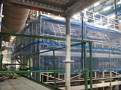 The TRT (Transition Radiation Tracker) central section, the outermost part of the Inner Detector, assembled above ground and taking data from cosmic rays[28] in September 2005.