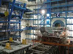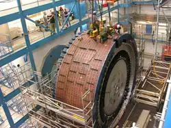 ATLAS detector under construction in October 2004 in the experiment pit. Construction was completed in 2008 and ATLAS has been successfully collecting data since November 2009, when colliding beam operation at the LHC started. Note the people in the background, for size comparison.