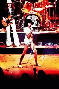 Queen's previous album, Sheer Heart Attack (1974), had obtained commercial success and brought the band mainstream attention, with the single "Killer Queen" reaching number two on the UK Singles Chart.[6] The album was a minor hit in the US, reaching number twelve, while "Killer Queen" hit the top 20.[7] Despite this success, the band was broke at the time, largely due to a contract they had signed which meant that they would produce albums for a production company, who would then sell the album to a record label.[8] This meant that Queen saw almost none of the money they earned, as Trident Studios paid them £60 weekly.[9][10] Guitarist Brian May was living in a bedsit in Earls Court, West London while frontman Freddie Mercury lived in a flat in Kensington that suffered from rising damp.[11] The matter eventually reached a turning point when bassist John Deacon, who had recently married, was denied a cash advance of £4,000 by manager Norman Sheffield to put a deposit on a house.[9][12][13] This increasing frustration led to Mercury writing the song "Death on Two Legs", which would serve as the opening track to A Night at the Opera.[14]