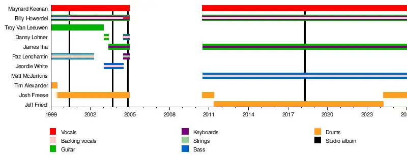 Prone to downtime due to Keenan's other musical commitments, the band has featured a variety of musicians throughout alternating periods of activity and inactivity, and has changed line-ups on each album, leaving Keenan and Howerdel the only constant members. The original incarnation of the band included Paz Lenchantin on bass, Troy Van Leeuwen on guitar, and Tim Alexander on drums. Alexander, however, only performed a handful of live shows and appeared on one song on the group's debut album before being replaced by Josh Freese. Band collaborator and producer Danny Lohner and bassist Jeordie White were also members for a short period in the early 2000s. The band's current lineup features Smashing Pumpkins guitarist James Iha, bassist Matt McJunkins, and drummer Josh Freese, the latter two also being contributors to the related Puscifer and Ashes Divide projects. Despite the varied cast and numerous lineup changes, the primary roles of creating A Perfect Circle's songs has remained consistent with Howerdel as music composer and Keenan writing lyrics and vocal melodies. The band's studio albums have been generally well received critically and commercially, with their first three studio albums selling 4 million copies collectively as of 2005.[1]