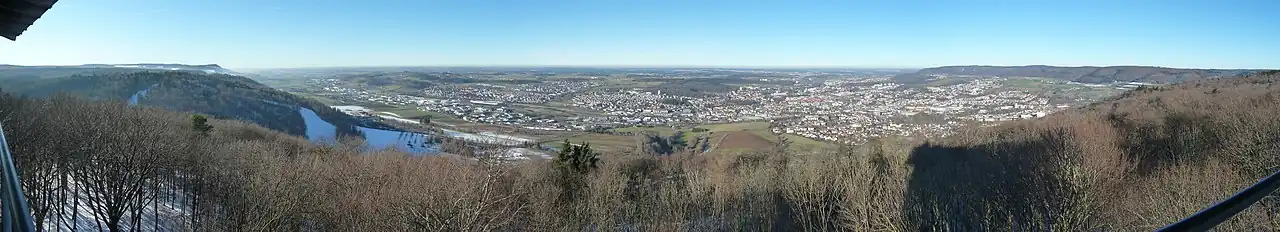 The west of Aalen's territory is on the foreland of the eastern Swabian Jura, and the north and north-west is on the Swabian-Franconian Forest, both being part of the Swabian Keuper-Lias Plains. The south-west is part of the Albuch, the east is part of the Härtsfeld, these two both being parts of the Swabian Jura.[4]