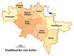 | Wasseralfingen | 15.97 | 11,767[16] | Affalterried, Brausenried, Bürgle, Erzhäusle, Heisenberg, Mäderhof, Onatsfeld, Rötenberg, Röthardt, Salchenhof, Treppach, Weidenfeld |