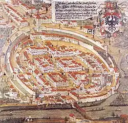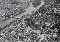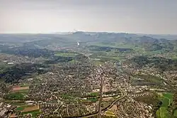 The old city of Aarau is situated on a rocky outcrop at a narrowing of the Aare river valley, at the southern foot of the Jura mountains.[6] Newer districts of the city lie to the south and east of the outcrop, as well as higher up the mountain, and in the valley on both sides of the Aare. The neighboring municipalities are Küttigen to the north and Buchs to the east, Suhr to the south-east, Unterentfelden to the south, and Eppenberg-Wöschnau and Erlinsbach to the west. Aarau and the nearby neighboring municipalities have grown together and now form an interconnected agglomeration. The only exception is Unterentfelden whose settlements are divided from Aarau by the extensive forests of Gönhard and Zelgli. Approximately nine-tenths of the city is south of the Aare, and one tenth is to the north. It has an area, as of 2006, of 8.9 km2 (3.4 sq mi). Of this area, 6.3% is used for agricultural purposes, while 34% is forested. Of the rest of the land, 55.2% is settled (buildings or roads) and the remainder (4.5%) is non-productive (rivers or lakes).[7] The lowest elevation, 365 meters (1,198 ft), is found at the banks of the Aar, and the highest elevation, at 471 meters (1,545 ft), is the Hungerberg on the border with Küttigen.