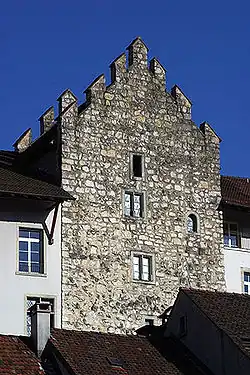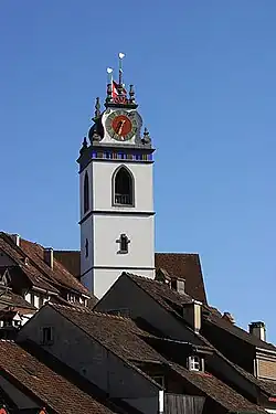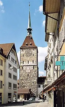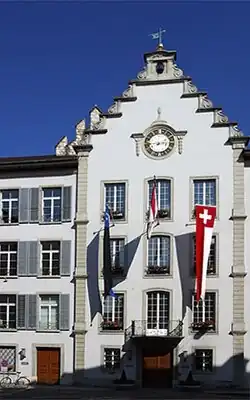 Aarau (Swiss Standard German: [ˈaːraʊ], Alemannic German pronunciation: [ˈɑːræu̯]) is a town, a municipality, and the capital of the northern Swiss canton of Aargau. The town is also the capital of the district of Aarau. It is German-speaking and predominantly Protestant. Aarau is situated on the Swiss plateau, in the valley of the Aare, on the river's right bank, and at the southern foot of the Jura Mountains,[2] and is west of Zurich,[3] 58 kilometres (36 miles) south of Basel and 65 kilometres (40 miles) northeast of Bern.[4] The municipality borders directly on the canton of Solothurn to the west. It is the largest town in Aargau. At the beginning of 2010 Rohr became a district of Aarau.[5]