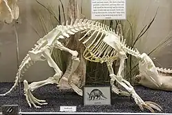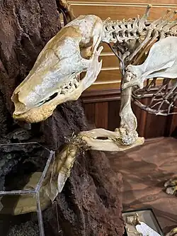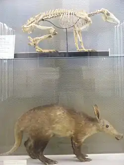The first unambiguous tubulidentate was probably Myorycteropus africanus from Kenyan Miocene deposits.[13] The earliest example from the genus Orycteropus was Orycteropus mauritanicus, found in Algeria in deposits from the middle Miocene, with an equally old version found in Kenya.[13] Fossils from the aardvark have been dated to 5 million years, and have been located throughout Europe and the Near East.[13]