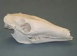 The greatly elongated head is set on a short, thick neck, and the end of the snout bears a disc, which houses the nostrils. It contains a thin but complete zygomatic arch.[22] The head of the aardvark contains many unique and different features. One of the most distinctive characteristics of the Tubulidentata is their teeth. Instead of having a pulp cavity, each tooth has a cluster of thin, hexagonal, upright, parallel tubes of vasodentin (a modified form of dentine), with individual pulp canals, held together by cementum.[16] The number of columns is dependent on the size of the tooth, with the largest having about 1,500.[13] The teeth have no enamel coating and are worn away and regrow continuously.[11] The aardvark is born with conventional incisors and canines at the front of the jaw, which fall out and are not replaced. Adult aardvarks have only cheek teeth at the back of the jaw, and have a dental formula of: 0.0.2-3.30.0.2.3 These remaining teeth are peg-like and rootless and are of unique composition.[28] The teeth consist of 14 upper and 12 lower jaw molars.[6] The nasal area of the aardvark is another unique area, as it contains ten nasal conchae, more than any other placental mammal.[16]