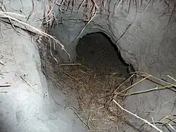 Aside from digging out ants and termites, the aardvark also excavates burrows in which to live, which generally fall into one of three categories: burrows made while foraging, refuge and resting location, and permanent homes.[5] Temporary sites are scattered around the home range and are used as refuges, while the main burrow is also used for breeding. Main burrows can be deep and extensive, have several entrances and can be as long as 13 metres (43 ft).[5] These burrows can be large enough for a person to enter.[6] The aardvark changes the layout of its home burrow regularly, and periodically moves on and makes a new one. The old burrows are an important part of the African wildlife scene. As they are vacated, then they are inhabited by smaller animals like the African wild dog, ant-eating chat, Nycteris thebaica and warthogs.[35] Other animals that use them are hares, mongooses, hyenas, owls, pythons, and lizards. Without these refuges many animals would die during wildfire season.[35] Only mothers and young share burrows; however, the aardvark is known to live in small family groups or as a solitary creature.[6] If attacked in the tunnel, it will escape by digging out of the tunnel thereby placing the fresh fill between it and its predator, or if it decides to fight it will roll onto its back, and attack with its claws.[6] The aardvark has been known to sleep in a recently excavated ant nest, which also serves as protection from its predators.[38]
