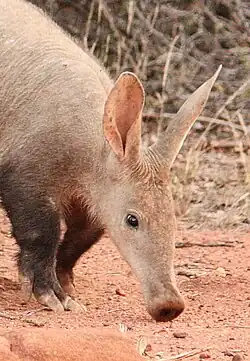 The sides of the nostrils are thick with hair.[22] The tip of the snout is highly mobile and is moved by modified mimetic muscles.[16] The fleshy dividing tissue between its nostrils probably has sensory functions,[5] but it is uncertain whether they are olfactory or vibratory in nature.[29] Its nose is made up of more turbinate bones than any other mammal, with between nine and 11, compared to dogs with four to five.[11] With a large quantity of turbinate bones, the aardvark has more space for the moist epithelium, which is the location of the olfactory bulb.[11] The nose contains nine olfactory bulbs, more than any other mammal.[22] Its keen sense of smell is not just from the quantity of bulbs in the nose but also in the development of the brain, as its olfactory lobe is very developed.[13] The snout resembles an elongated pig snout. The mouth is small and tubular, typical of species that feed on ants and termites. The aardvark has a long, thin, snakelike, protruding tongue (as much as 30 centimetres (12 in) long)[6] and elaborate structures supporting a keen sense of smell.[30] The ears, which are very effective,[6] are disproportionately long, about 20–25 centimetres (7.9–9.8 in) long.[22] The eyes are small for its head, and consist only of rods.[22]