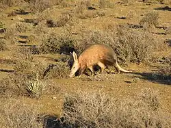 Recent research suggests that aardvarks may be particularly vulnerable to alterations in temperature caused by climate change. Droughts negatively impact the availability of termites and ants, which comprise the bulk of an aardvark's diet.[39] Nocturnal species faced with resource scarcity may increase their diurnal activity to spare the energy costs of staying warm at night, but this comes at the cost of withstanding high temperatures during the day. A study on aardvarks in the Kalahari Desert saw that five out of six aardvarks being studied perished following a drought.[40]