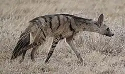 The aardwolf (Proteles cristatus[4]) is an insectivorous hyaenid species, native to East and Southern Africa. Its name means 'earth-wolf' in Afrikaans and Dutch.[5][6] It is also called the maanhaar-jackal[7][8] (Afrikaans for 'mane-jackal'), termite-eating hyena[9] and civet hyena, based on its habit of secreting substances from its anal gland, a characteristic shared with the African civet.[10]