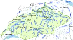 Its total length from its source to its junction with the Rhine comprises about 295 kilometres (183 mi),[3][5] during which distance it descends 1,565 m (5,135 ft), draining an area of 17,779 km2 (6,865 sq mi), almost entirely within Switzerland, and accounting for close to half the area of the country, including all of Central Switzerland.[5]