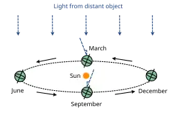 Consider the case where a distant star is motionless relative to the Sun, and the star is extremely far away, so that parallax may be ignored. In the rest frame of the Sun, this means light from the star travels in parallel paths to the Earth observer, and arrives at the same angle regardless of where the Earth is in its orbit. Suppose the star is observed on Earth with a telescope, idealized as a narrow tube. The light enters the tube from the star at angle and travels at speed taking a time to reach the bottom of the tube, where it is detected. Suppose observations are made from Earth, which is moving with a speed . During the transit of the light, the tube moves a distance . Consequently, for the particles of light to reach the bottom of the tube, the tube must be inclined at an angle different from , resulting in an apparent position of the star at angle . As the Earth proceeds in its orbit it changes direction, so changes with the time of year the observation is made. The apparent angle and true angle are related using trigonometry as: