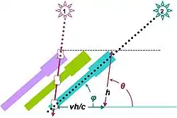 1. ^ More in detail, Fresnel explains that the incoming light of angle is first refracted at the end of the telescope, to a new angle within the telescope. This may be accounted for by Snell's law, giving . Then drag must be accounted for. Without drag, the x and y components of the light in the telescope are and , but drag modifies the x component to if the Earth moves with velocity . If is angle and is the velocity of the light with these velocity components, then by Bradley's reasoning where is the modified path length through the water and t is the time it takes the light to travel the distance h, . Upon solving these equations for in terms of one obtains Bradley's vacuum result.