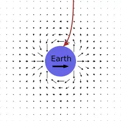 Conceptual illustration of Stokes' aether drag theory. In the rest frame of the Sun the Earth moves to the right through the aether, in which it induces a local current. A ray of light (in red) coming from the vertical becomes dragged and tilted due to the flow of aether.
