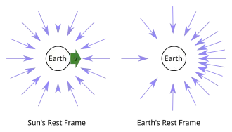 Light rays striking the earth in the Sun's rest frame compared to the same rays in the Earth's rest frame according to special relativity. The effect is exaggerated for illustrative purposes.