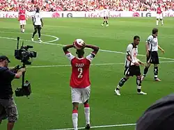 On 1 May, Diaby suffered a severe ankle fracture after being on the receiving end of a tackle, described by the media as "horrendous", from Sunderland defender Dan Smith.[39][40] After the match, Wenger described the tackle as "a bad kick and an unnecessary one" and also criticised his competitors' over-physicality, while interim Sunderland manager Kevin Ball defended Smith stating "Smith is not a malicious, dirty player and I think it's unfair to make that call on him and say he deliberately went to do it. Dan went for the ball, unfortunately Diaby was quicker than him".[41][42] As a result of the injury, Diaby missed the 2006 UEFA Champions League Final, as well as the 2006 UEFA European Under-21 Football Championship. He underwent three surgeries to repair the injury and was told by doctors that the injury could possibly be career-ending.[43] Following the surgeries, he underwent eight months of rehabilitation and made his return to first team action in the 2006–07 season in a League Cup match against Liverpool. He appeared as a substitute in the match as Arsenal won 6–3.[44] On 25 February 2007, while participating in the 2007 Football League Cup Final against Chelsea, Diaby, while attempting to clear the ball out of the Arsenal defense, accidentally kicked rival defender John Terry in the face. Unconscious, Terry was stretchered off and hospitalized, but recovered to return to the Millennium Stadium in Cardiff for the trophy presentation following Chelsea's 2–1 win.[45] Though Arsenal lost, Diaby was credited with an assist on the team's only goal of the match, which was converted by Theo Walcott.[46] Diaby scored his first and only goal of the campaign on 14 March in a 1–0 win over Aston Villa when he deflected in a Júlio Baptista shot.[47] He remained a fixture within the team for the rest of the campaign, mostly as a substitute as he only started in consecutive matches once.