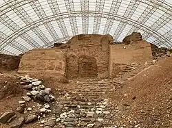 The earliest possible reference to Abraham may be the name of a town in the Negev listed in the Bubastite Portal inscription of Pharaoh Sheshonq I (biblical Shishak), which is referred as "the Fortress of Abraham", suggesting the possible existence of an Abraham tradition in the 10th century BCE.[93][94] The orientalist Mario Liverani has proposed to see in the name Abraham the eponymous ancestor of a 13th-century BCE tribe, the Raham, mentioned in a stele of Seti I found at Beth-Shean and dating back to around 1289 BCE. The tribe probably lived in the area surrounding or close to Beth-Shean, in Galilee (the stele in fact refers to battles that took place in the area). Liverani hypothesized that the members of the tribe of Raham called themselves "sons of Raham" (*Banu-Raham), so that the name of their eponymous ancestor would have been "father of Raham" (*Abu-Raham), that being the name of the patriarch Abraham.[95] Israel Finkelstein and Thomas Römer suggested that the oldest Abraham traditions originated in the Iron Age (monarchic period) and that they contained an autochthonous hero story, as the oldest biblical references to Abraham outside the book of Genesis (Ezekiel 33 and Isaiah 51) do not have an indication of a Mesopotamian origin of Abraham and present only two main themes of the Abraham narrative in Genesis—land and offspring.[96] Finkelstein and Römer considered Abraham as ancestor who was worshiped in Hebron, with the oldest tradition of him possibly being about the altar he built in Hebron.[96]