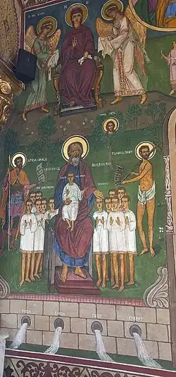 The Roman Catholic Church, the largest Christian denomination, calls Abraham "our father in Faith" in the Eucharistic prayer of the Roman Canon, recited during the Mass. He is also commemorated in the calendars of saints of several denominations: on 20 August by the Maronite Church, 28 August in the Coptic Church and the Assyrian Church of the East (with the full office for the latter), and on 9 October by the Roman Catholic Church and the Lutheran Church–Missouri Synod.[117] In the introduction to his 15th-century translation of the Golden Legend's account of Abraham, William Caxton noted that this patriarch's life was read in church on Quinquagesima Sunday.[118] He is the patron saint of those in the hospitality industry.[119] The Eastern Orthodox Church commemorates him as the "Righteous Forefather Abraham", with two feast days in its liturgical calendar. The first time is on 9 October (for those churches which follow the traditional Julian Calendar, 9 October falls on 22 October of the modern Gregorian Calendar), where he is commemorated together with his nephew "Righteous Lot". The other is on the "Sunday of the Forefathers" (two Sundays before Christmas), when he is commemorated together with other ancestors of Jesus. Abraham is also mentioned in the Divine Liturgy of Basil the Great, just before the Anaphora, and Abraham and Sarah are invoked in the prayers said by the priest over a newly married couple. A popular hymn sung in many English-speaking Sunday Schools by children is known as "Father Abraham" and emphasizes the patriarch as the spiritual progenitor of Christians.[120]