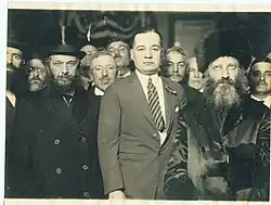 Although Kook was a very learned man, he was never accepted by the Haredi leadership.[38] In 1921 his detractors bought up the whole edition of his newly published Orot to prevent its circulation, plastering the offending passages on the walls of Meah Shearim.[39] Later, an anonymous pamphlet entitled Kol Ha-Shofar appeared containing a declaration signed by rabbis Sonnenfeld, Diskin and others saying: "We were astonished to see and hear gross things, foreign to the entire Torah, and we see that which we feared before his coming here, that he will introduce new forms of deviance that our rabbis and ancestors could not have imagined …. It is to be deemed a sorcerer's book? If so, let it be known that it is forbidden to study [let alone] rely on all his nonsense and dreams."[40] It also quoted Aharon Rokeach of Belz who stated "And know that the rabbi from Jerusalem, Kook - may his name be blotted out - is completely wicked and has already ruined many of our youth, entrapping them with his guileful tongue and impure books."[41] Returning to Poland after a visit to Palestine in 1921, Rabbi Avraham Mordechai Alter of Ger wrote that he endeavoured to calm the situation by getting Kook to renounce any expressions which may have unwittingly resulted in a profanation of God's name. He then approached the elder rabbis of the Yishuv asking them to withdraw their denunciation. The rabbis claimed that their intention had been to reach a consensus on whether Kook's writings were acceptable, but their letter had been surreptitiously inserted by Kook's critics in to their inflammatory booklet without their knowledge.