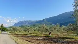 There are two climatic zones in Abruzzo. The coastal strip and sub-Apennine hills have a climate distinct from that of the mountainous interior. Coastal areas have a Mediterranean climate with hot dry summers and mild winters. Inland hilly areas have a sublittoral climate with temperatures decreasing with altitude.[45] Precipitation is also strongly affected by the presence of the Apennines mountain range. Rainfall is abundant on slopes oriented to the west, and lower in the east and on east-facing slopes. The Adriatic coast is shielded from rainfall by the barrier effect created by the Apennines.[46] The minimum annual rainfall is found in some inland valleys sheltered by mountain ranges, such as the Peligna or Tirino valleys (near Ofena, Capestrano), annual rainfall as low as 500 millimetres (19.7 inches) has been recorded. Rainfall along the coast almost never falls below 600 millimetres (23.6 inches). Pescara has relatively less rainfall (about 700 millimetres (27.6 inches)) than Chieti (about 1,000 millimetres (39.4 inches)).[46] The highest rainfall occurs in upland areas on the border with Lazio; these areas are especially vulnerable to Atlantic disturbances. Around 1,500 to 2,000 millimetres (59 to 79 inches) of precipitation is typical.[47]