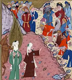 A 1595 Ottoman miniature from the Siyer-i Nebi depicting Abu Bakr intervening to stop a Meccan mob, led by Abu Lahab, from attacking Muhammad at the Souk of Okaz.