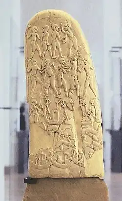 Most of Upper Egypt became unified under rulers from Abydos during the Naqada III period (3200–3000 BCE), at the expense of rival cities such as Nekhen.[7] The conflicts leading to the supremacy of Abydos may appear on numerous reliefs of the Naqada II period, such as the Gebel el-Arak Knife, or the frieze of Tomb 100 at Hierakonpolis.[6]