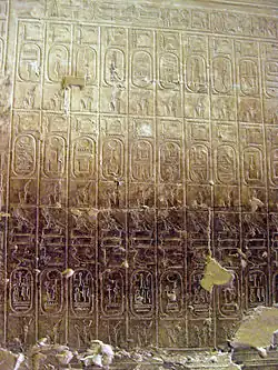 Today, Abydos is notable for the memorial temple of Seti I, which contains an inscription from the Nineteenth Dynasty known to the modern world as the Abydos King List. This is a chronological list showing cartouches of most dynastic pharaohs of Egypt from Menes until Seti I's father, Ramesses I.[4] It is also notable for the Abydos graffiti, ancient Phoenician and Aramaic graffiti found on the walls of the Temple of Seti I.