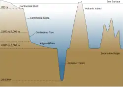The aphotic zone can be subdivided into three different vertical regions, based on depth and temperature. First is the bathyal zone, extending from a depth of 1,000 metres down to 3,000 metres, with water temperature decreasing from 12 °C (54 °F) to 4 °C (39 °F) as depth increases.[11] Next is the abyssal zone, extending from a depth of 3,000 metres down to 6,000 metres.[11] The final zone includes the deep oceanic trenches, and is known as the hadal zone. This, the deepest oceanic zone, extends from a depth of 6,000 metres down to approximately 11,034 meters, at the very bottom of the Mariana Trench, the deepest point on planet Earth.[2][11] Abyssal plains are typically in the abyssal zone, at depths from 3,000 to 6,000 metres.[1]