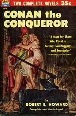 Ace's second title was a western (also tête-bêche): William Colt MacDonald's Bad Man's Return, bound with J. Edward Leithead's Bloody Hoofs.[5] Mysteries and westerns alternated regularly for the first thirty titles, with a few books not in either genre, such as P. G. Wodehouse's Quick Service, bound with his The Code of the Woosters. In 1953, A. E. van Vogt's The World of Null-A, bound with his The Universe Maker, appeared; this was Ace's first foray into science fiction. (Earlier in 1953, Ace had released Theodore S. Drachman's Cry Plague!, with a plot that could be regarded as science fiction, but the book it was bound with—Leslie Edgley's The Judas Goat—is a mystery.) Another science fiction double followed later in 1953, and science fiction rapidly established itself, alongside westerns and mysteries, as an important part of Ace's business.[13] By 1955, the company released more science fiction titles each year than in either of the other two genres, and from 1961 onward, science fiction titles outnumbered mysteries and westerns combined. Ace also published a number of lurid juvenile delinquent novels in the 1950s that are now very collectible, such as D-343, The Young Wolves by Edward De Roo and D-378, Out for Kicks by Wilene Shaw.[11]