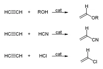 - ^ a b Trotuş, Ioan-Teodor; Zimmermann, Tobias; Schüth, Ferdi (2014). "Catalytic Reactions of Acetylene: A Feedstock for the Chemical Industry Revisited". Chemical Reviews. 114 (3): 1761–1782. doi:10.1021/cr400357r. PMID 24228942.