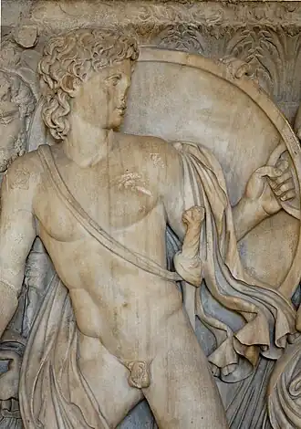 In Dares Phrygius's Account of the Destruction of Troy,[37] the Latin summary through which the story of Achilles was transmitted to medieval Europe, as well as in older accounts, Troilus was a young Trojan prince, the youngest of King Priam's and Hecuba's five legitimate sons (or according other sources, another son of Apollo).[38] Despite his youth, he was one of the main Trojan war leaders, a "horse fighter" or "chariot fighter" according to Homer.[39] Prophecies linked Troilus's fate to that of Troy and so he was ambushed in an attempt to capture him. Yet Achilles, struck by the beauty of both Troilus and his sister Polyxena, and overcome with lust, directed his sexual attentions on the youth—who, refusing to yield, instead found himself decapitated upon an altar-omphalos of Apollo Thymbraios.[40] Later versions of the story suggested Troilus was accidentally killed by Achilles in an over-ardent lovers' embrace.[41] In this version of the myth, Achilles's death therefore came in retribution for this sacrilege.[42] Ancient writers treated Troilus as the epitome of a dead child mourned by his parents. Had Troilus lived to adulthood, the First Vatican Mythographer claimed, Troy would have been invincible; however, the motif is older and found already in Plautus's Bacchides.[43]