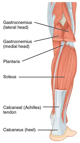 1. ^ Doral MN, Alam M, Bozkurt M, Turhan E, Atay OA, Dönmez G, Maffulli N (May 2010). "Functional anatomy of the Achilles tendon". Knee Surgery, Sports Traumatology, Arthroscopy. 18 (5): 638–643. doi:10.1007/s00167-010-1083-7. PMID 20182867. S2CID 24159374.