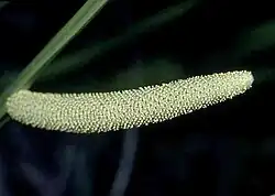 Only plants that grow in water bear flowers. The fruit is a berry filled with mucus, which when ripe falls into the water and disperses by floating. The solid, triangular flower-stems rise from the axils of the outer leaves. A semi-erect spadix emerges from one side of the flower stem. The spadix is solid, cylindrical, tapers at each end, and is 5 to 10 cm in length. A covering spathe, as is usual with Araceae, is absent. The spadix is densely crowded with tiny greenish-yellow flowers. Each flower contains six petals and stamens enclosed in a perianth with six divisions, surrounding a three-celled, oblong ovary with a sessile stigma. The flowers are sweetly fragrant.[6][7] In Europe, it flowers for about a month in late spring or early summer, but does not bear fruit. In Asia, it also fruits sparingly, and propagates itself mainly by growth of its rhizome, forming colonies.